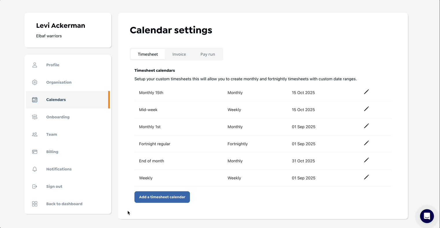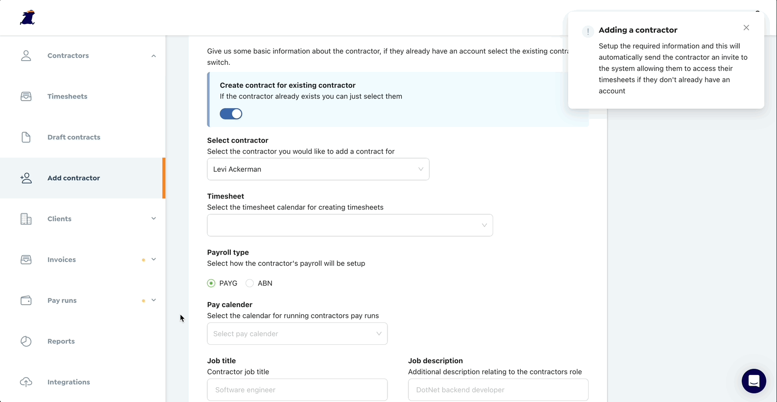 Our timesheet calendar feature allows you to customise and setup different timesheets for different contractors. We support weekly, fortnightly and monthly timesheets where you get to set the start date.