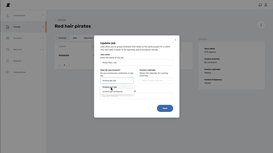 Linking jobs to Xero contacts lets you invoice a set of contracts for a client to a different team.