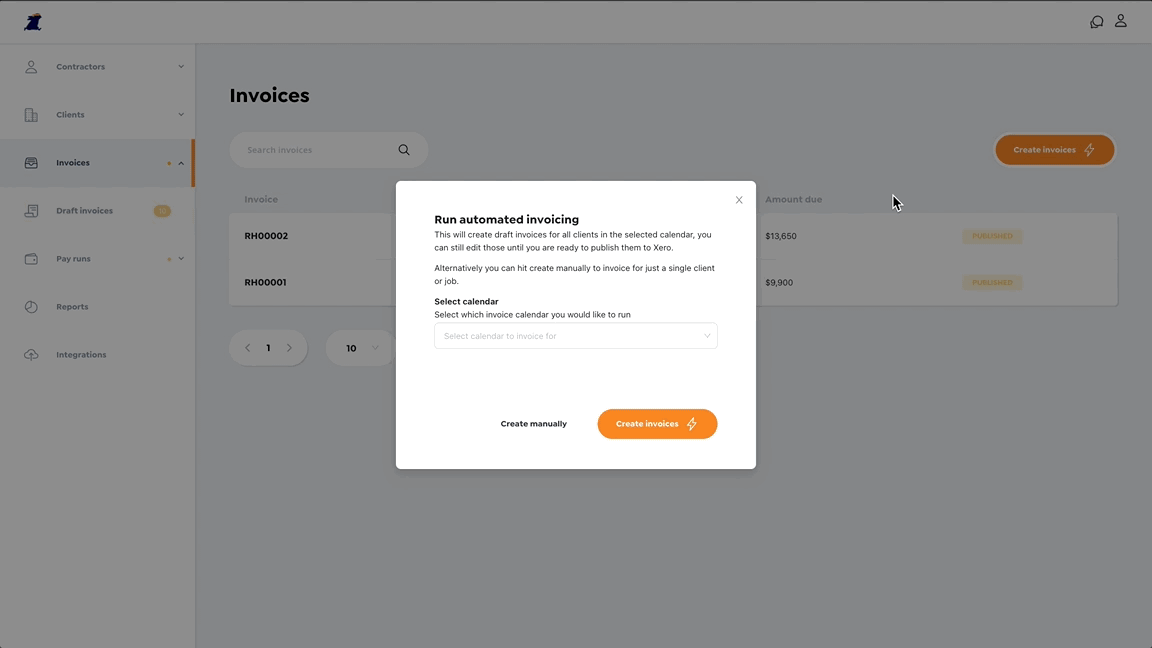 Creating an invoice for a job is just like creating one for a client. Click on "Create invoices" from from the "Invoices" page. You have the option of automatically generating invoices based on timesheets that are ready to be invoiced or manually selecting the timesheets to include.