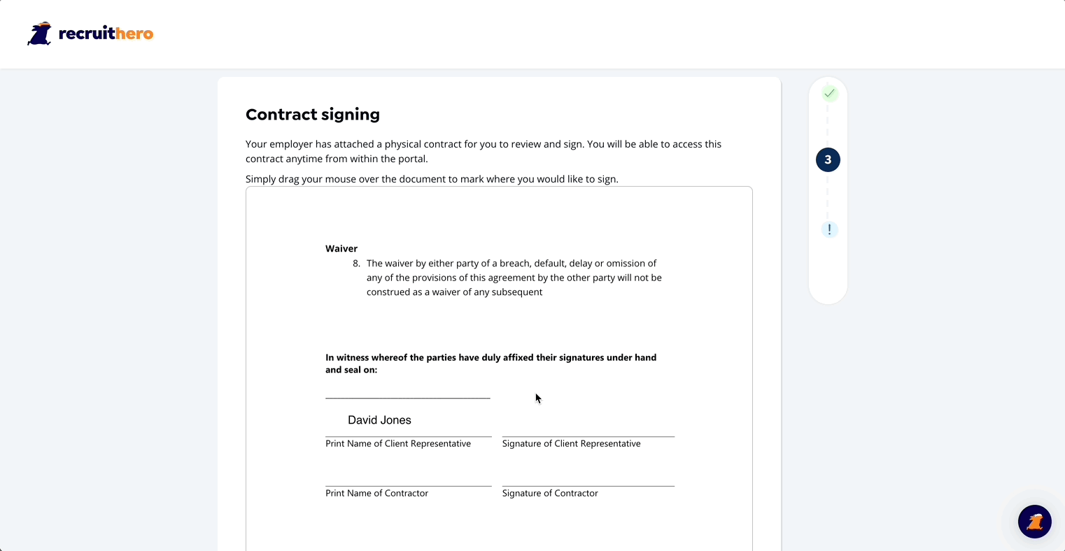 You can now easily sign your contract directly in Recruithero as part of your onbaording process. Simply add any required information and add your signature.